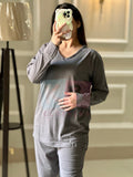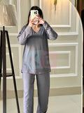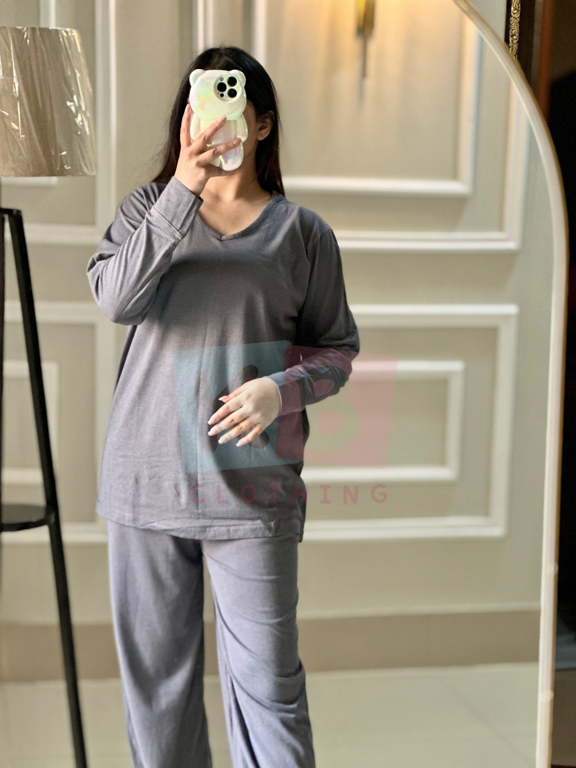 Plain Grey V Neck with Palazzo Style Pajama Full Sleeves Suit for Her