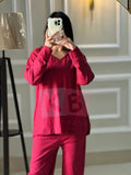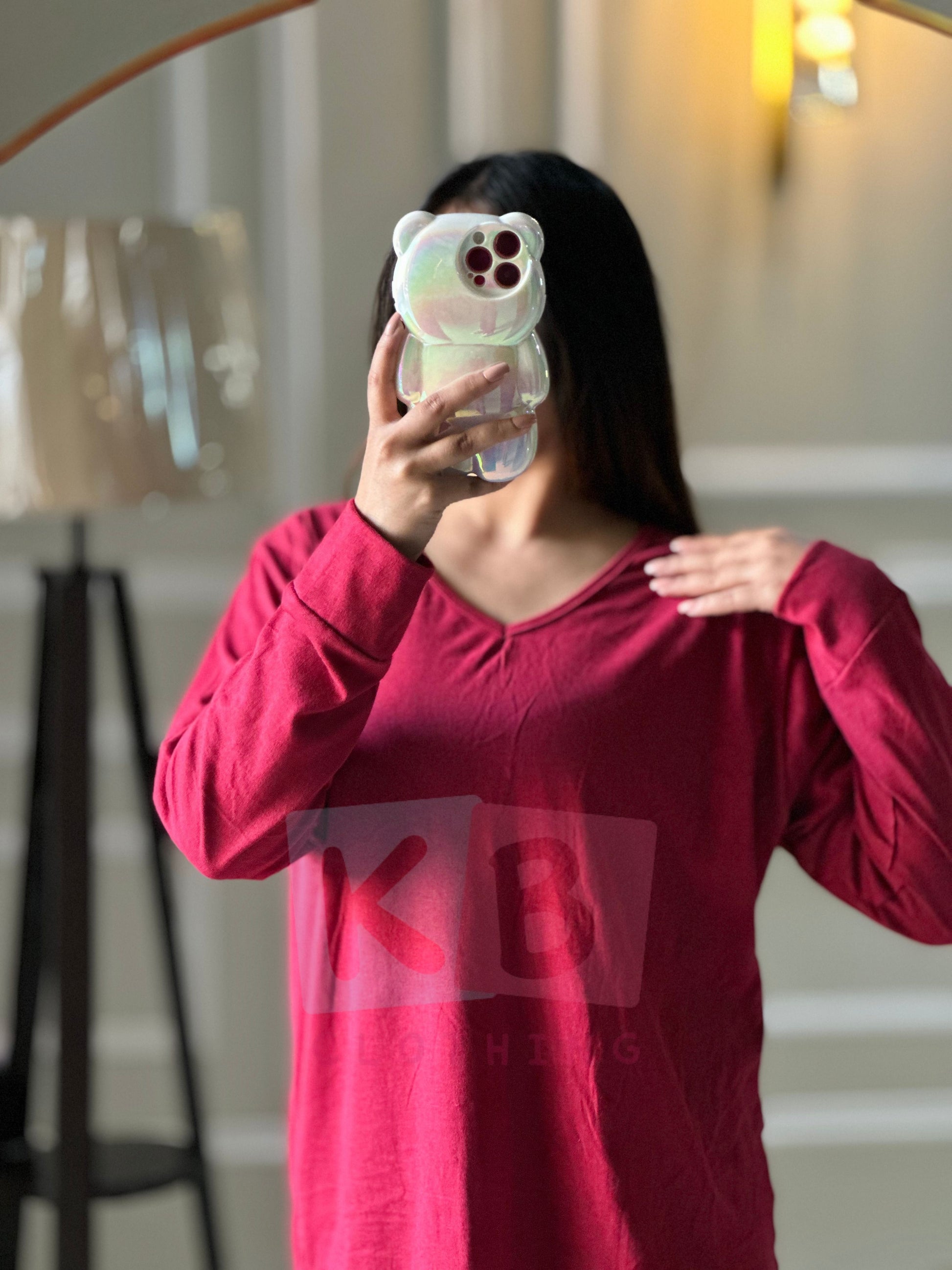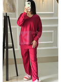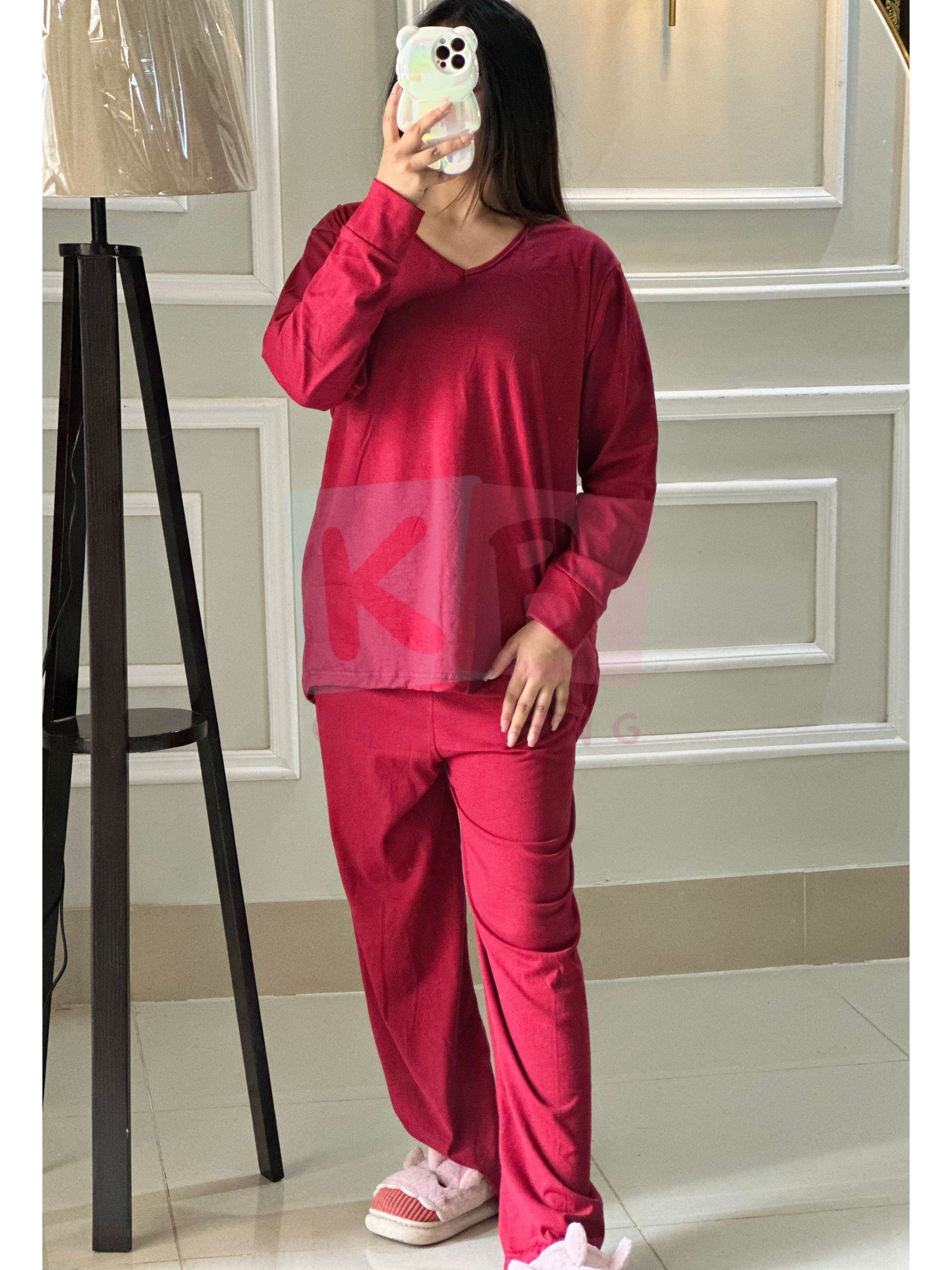 Plain Maroon V Neck with Palazzo Style Pajama Full Sleeves Suit for Her